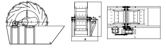 洗砂機(jī)工作時(shí),電機(jī)通過三角帶、減速機(jī)、齒輪減速后帶動(dòng)葉輪緩慢轉(zhuǎn)動(dòng),砂石有給料槽進(jìn)入洗槽中,在葉輪的帶動(dòng)下翻滾,并互相研磨,除去覆蓋砂石表面的雜質(zhì),同時(shí)破壞包覆砂粒的水汽層,以利于脫水;同時(shí)加水,形成強(qiáng)大水流,及時(shí)將雜質(zhì)及比重小的異物帶走,并從溢出口洗槽排出,完成清洗作用。干凈的砂石由葉片帶走,最后砂石從旋轉(zhuǎn)的葉輪倒入出料槽,完成砂石的清洗作用.